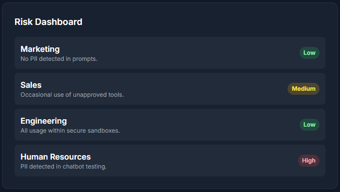 IQ Harvest automatically discovers every AI tool being used across your organization, approved or not. Get real-time visibility into who is using what, where data is flowing, and which tools pose compliance risks.